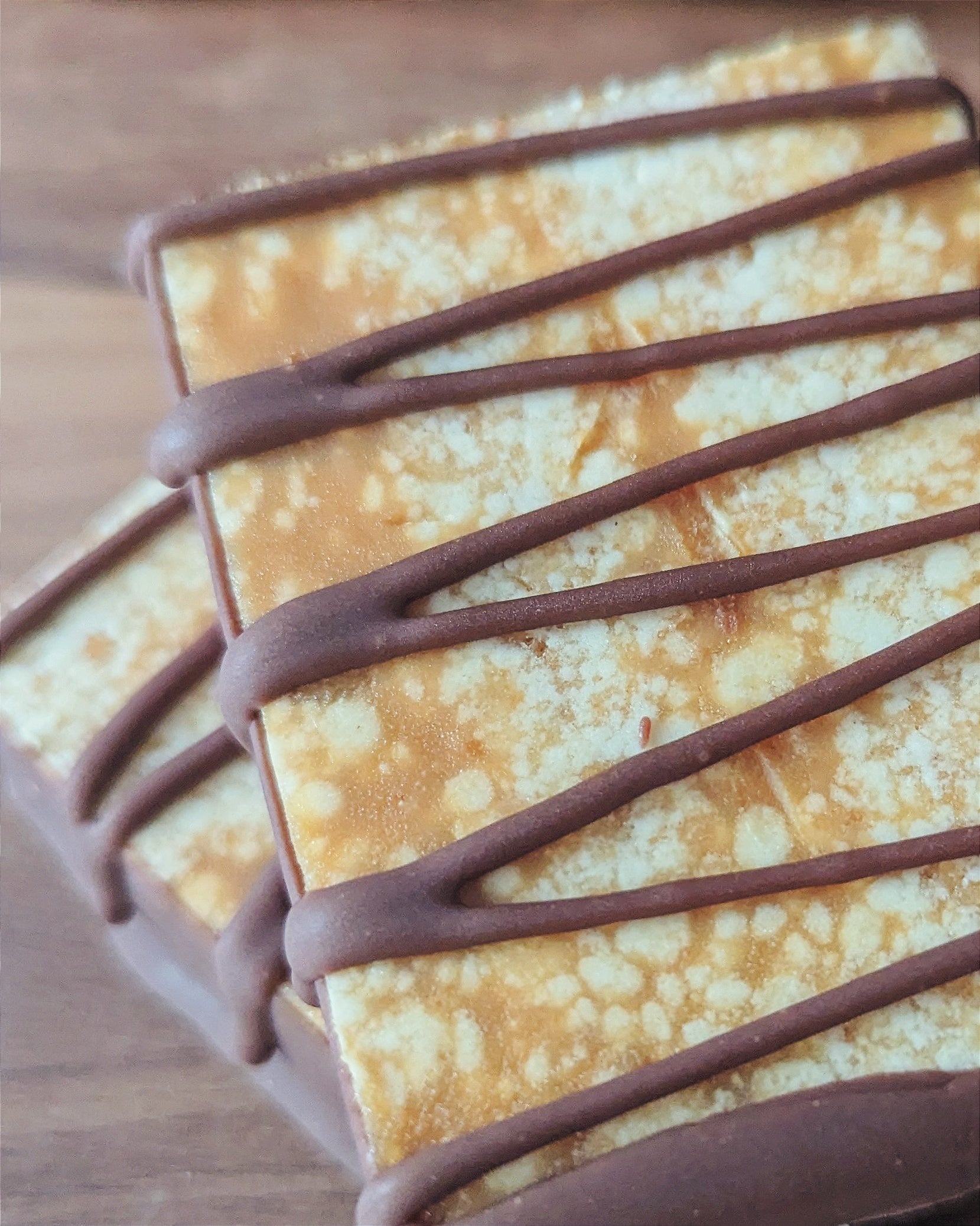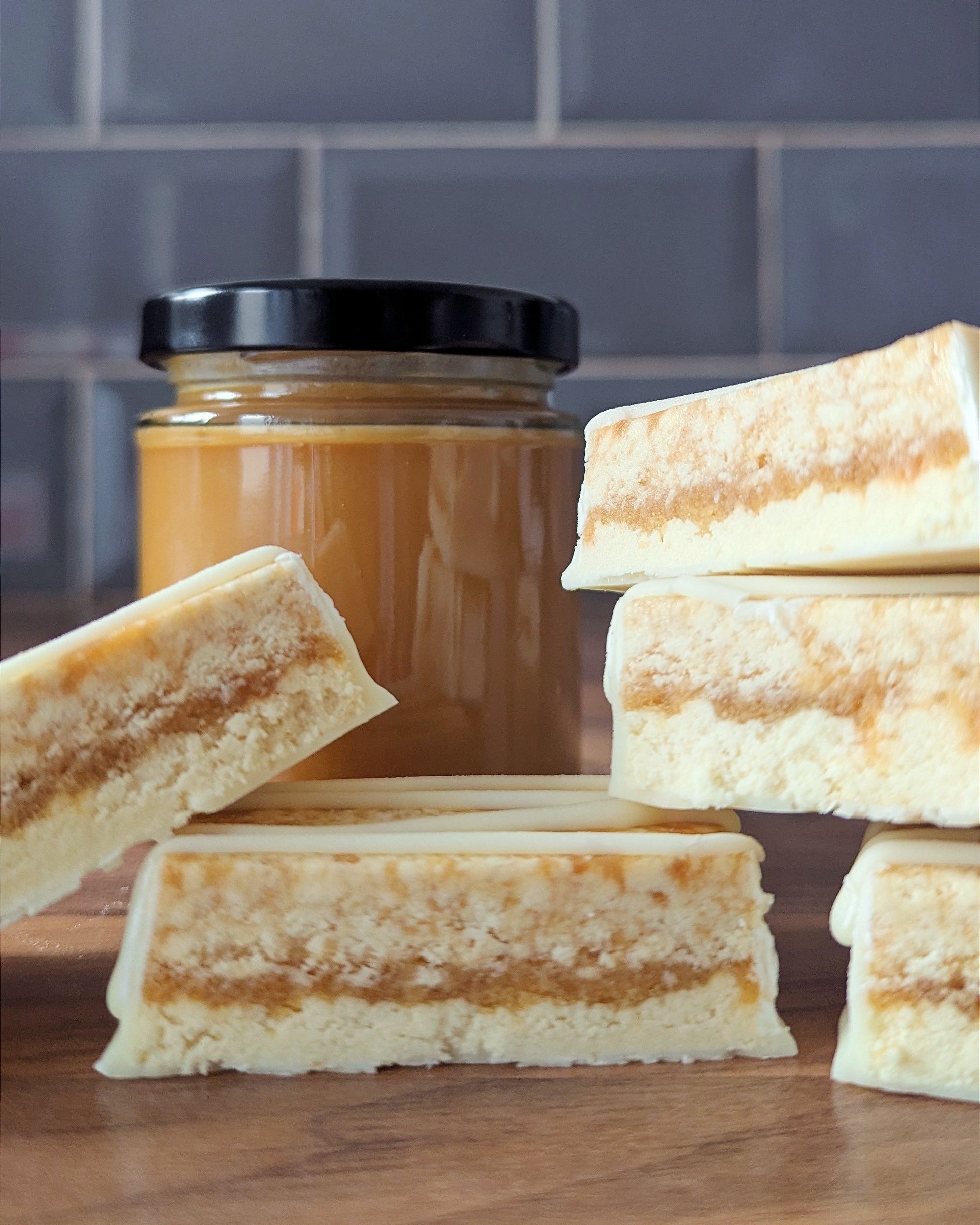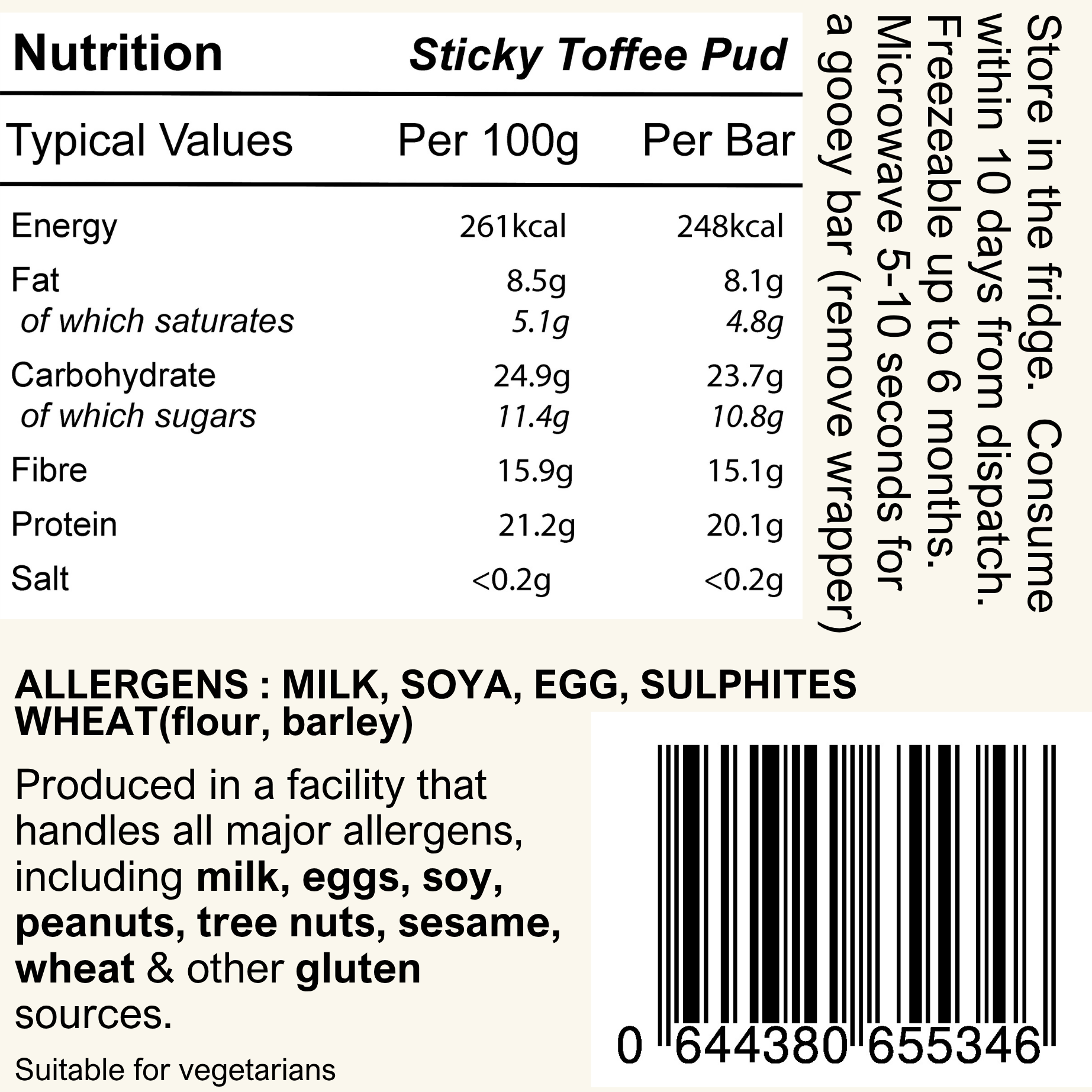 A top layer of sticky toffee flavoured protein, a hidden middle layer of Sticky Toffee Sauce from Wild & Fruitful Preserves, and with actual stick toffee cake layered on top. A bottom layer of soft toffee protein. Bottom & side enrobed in white or milk chocolate, and as always, finished with a chocolate drizzle